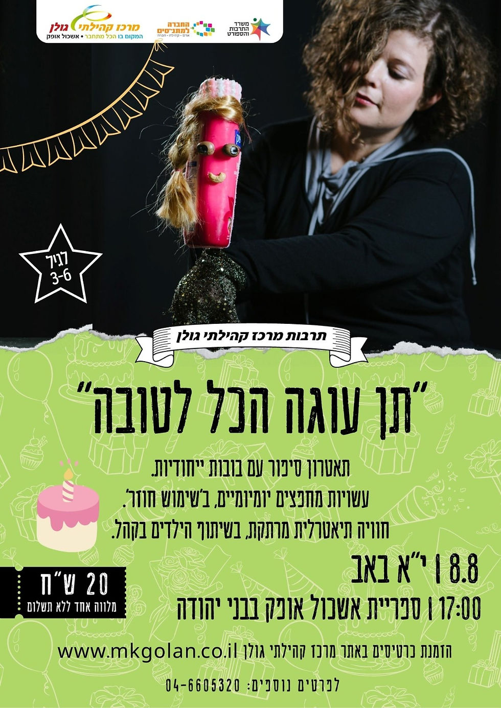 8.8 יום שני הצגת ילדים בספרייה. "תן עוגה הכל לטובה" לפרטים וכרטיסים: https://mkgolan.co.il/events/179/